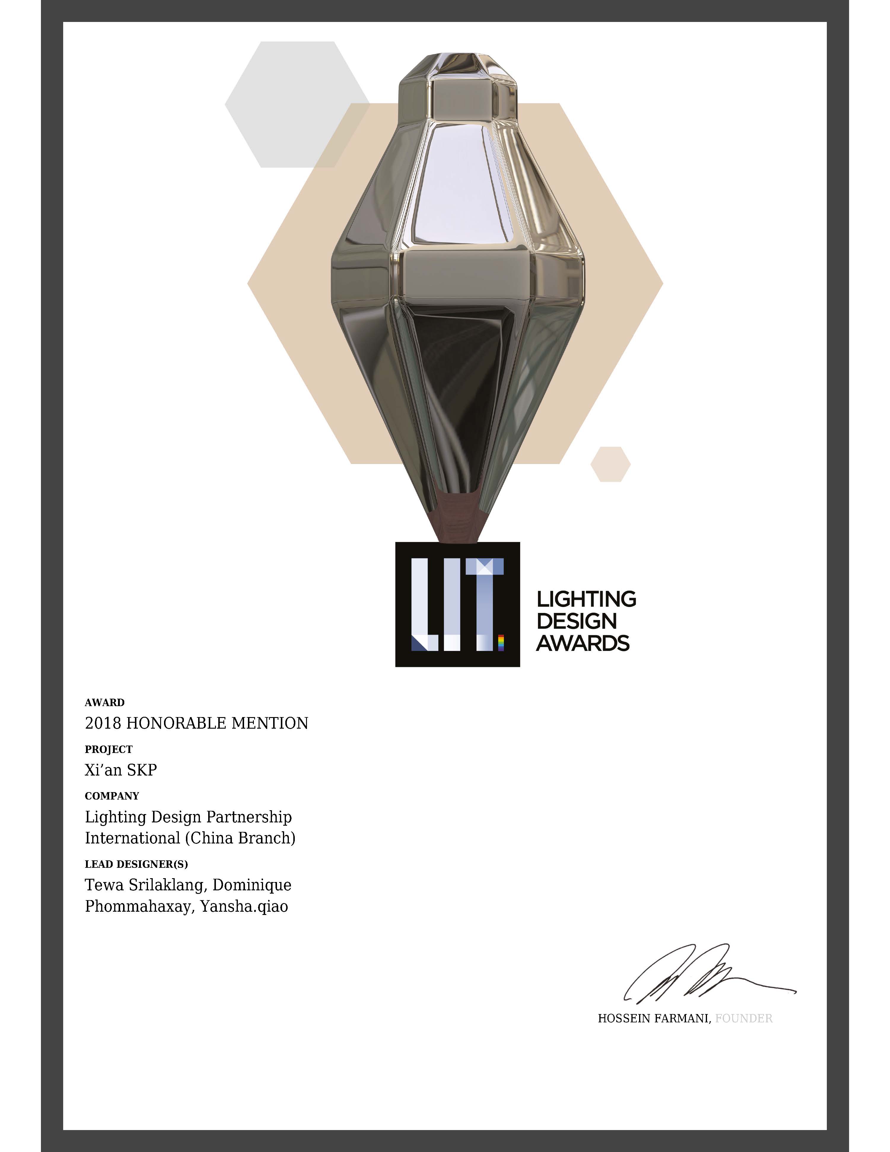 It is with great honor that Lighting Design Partnership International (China Branch) has received the Lighting Design Awards of 2018 Honorable Mention for the lighting design of Xi'an SKP.